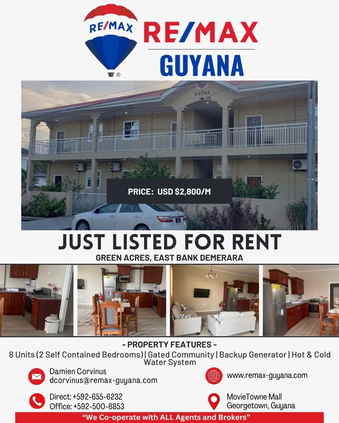 Experience secure and comfortable living in this newly built apartment complex located in the gated community of Green Acres, East Bank Demerara. The property offers 8 spacious 2-Fully Self contained bedroom units, each designed with modern finishes and everyday convenience in mind.