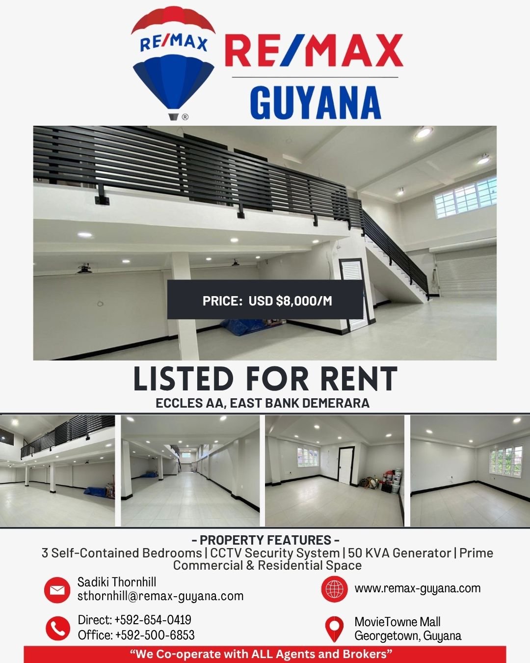 Located in the highly desirable Eccles AA neighborhood on the East Bank of Demerara, just 15 minutes from Georgetown, this prime property offers the perfect blend of commercial and residential space. Ideal for businesses or individuals seeking a comfortable and convenient location, this property provides unmatched versatility to suit a wide range of needs.