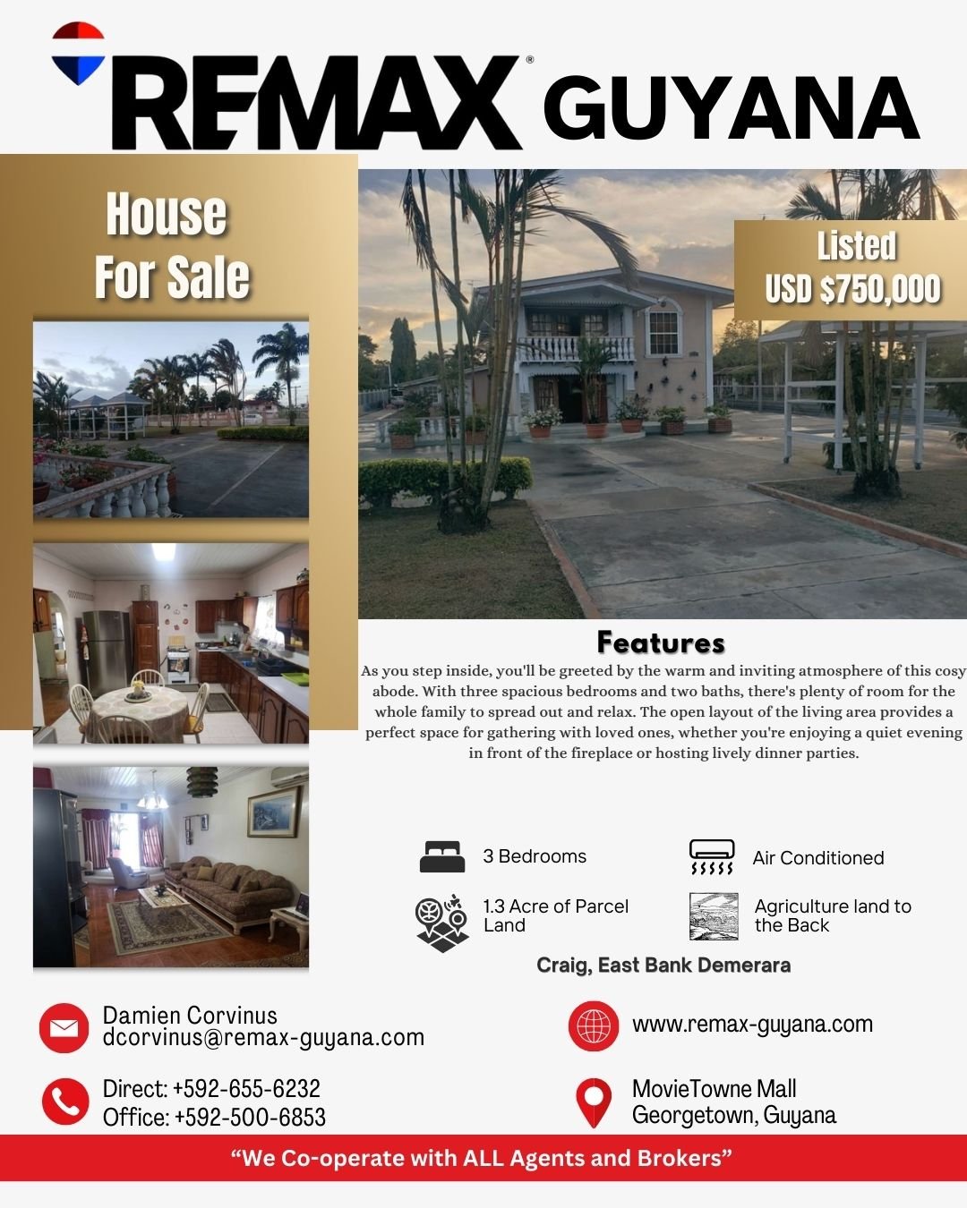 Additional Contact: +592-655-6232, +592-500-6853, dcorvinus@remax-guyana.com