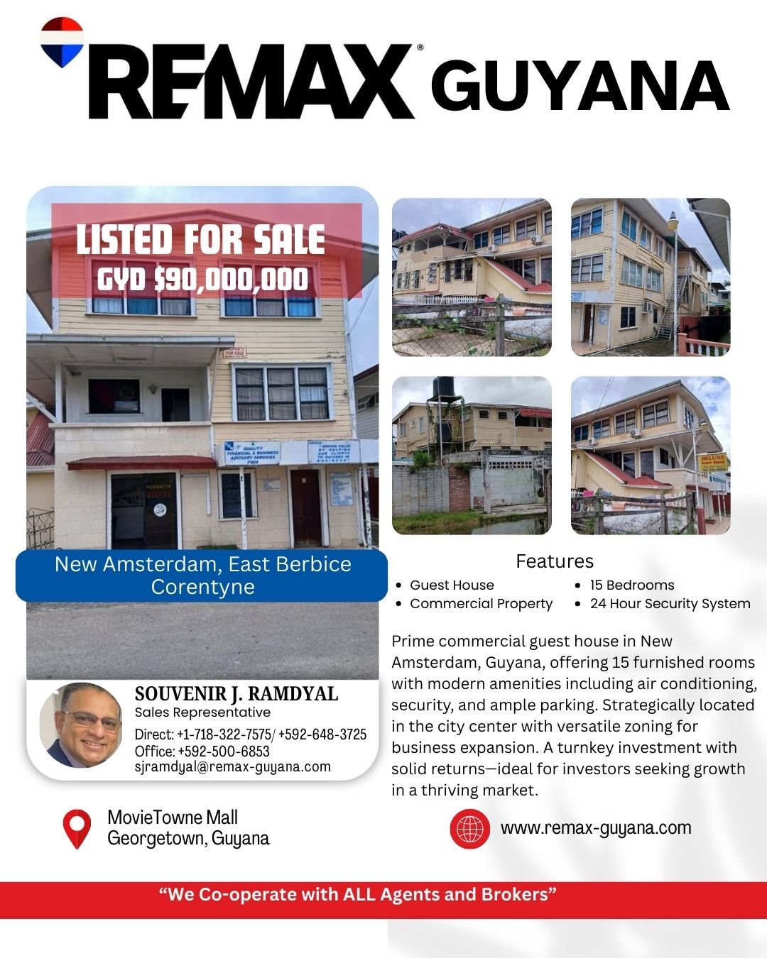 Prime commercial guest house in New Amsterdam, offering 15 furnished rooms with modern amenities including air conditioning, security, and ample parking.
