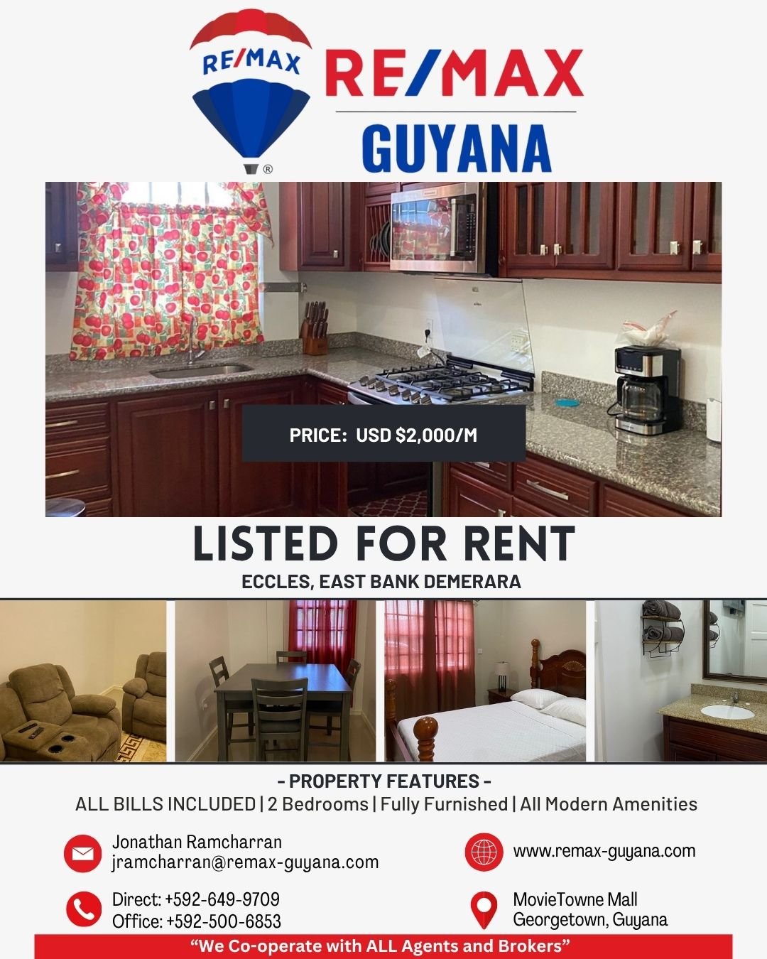 This 2 bedroom, 1 bathroom, apartment, fully furnished is available for rental in Eccles. Priced at USD 2,000/month.