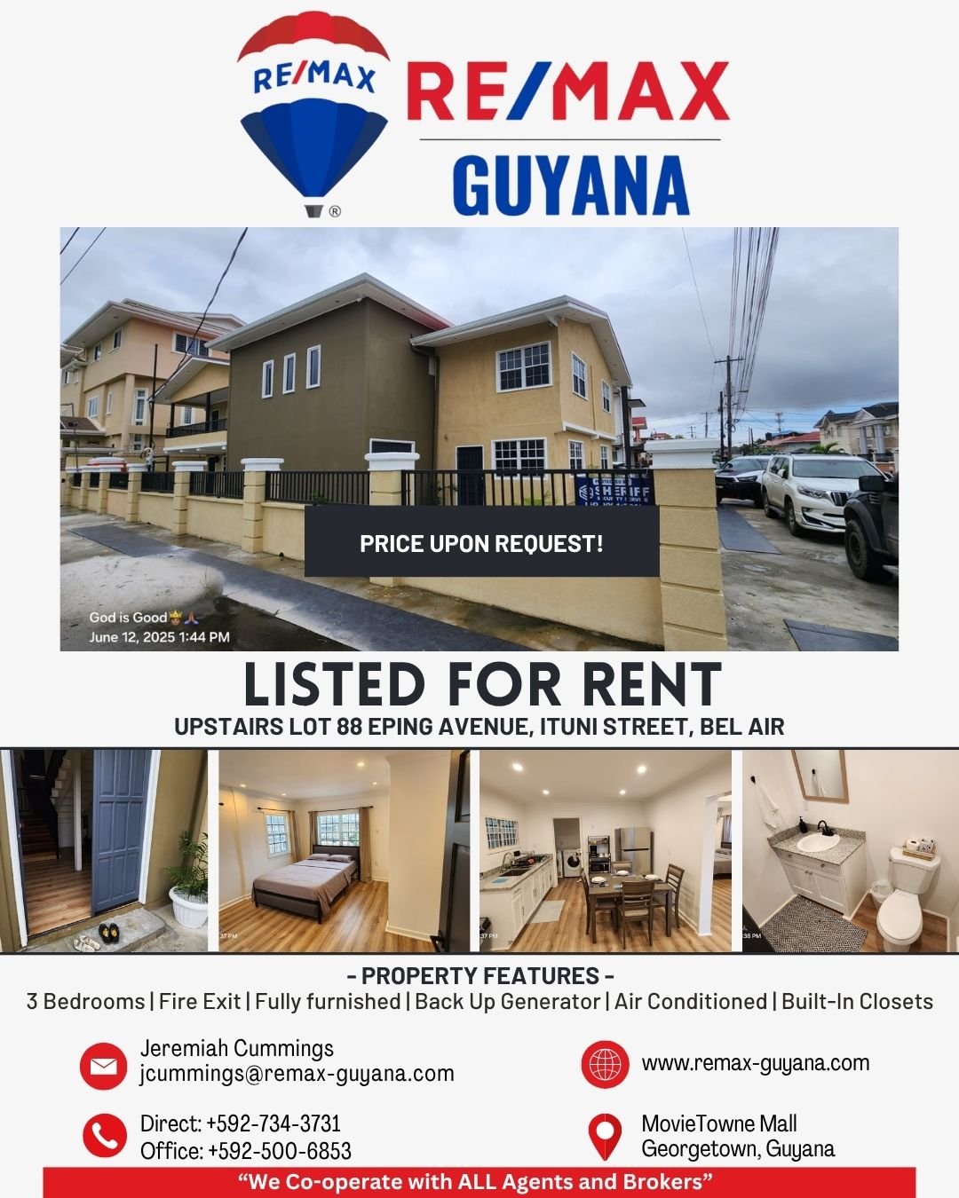Elevate your lifestyle with this fully furnished 2-bedroom, 2-bathroom upstairs apartment, ideally located on Eping Avenue, Ituni Street, Bel Air Park, Georgetown. Designed for comfort and convenience, this spacious residence features fully air-conditioned interiors, an open-concept living and dining area, and a modern kitchen with pantry, ample cabinetry, and essential appliances including a washer and dryer. Both bedrooms are equipped with built-in closets, while the bathrooms are fitted with contemporary fixtures and hot & cold water.