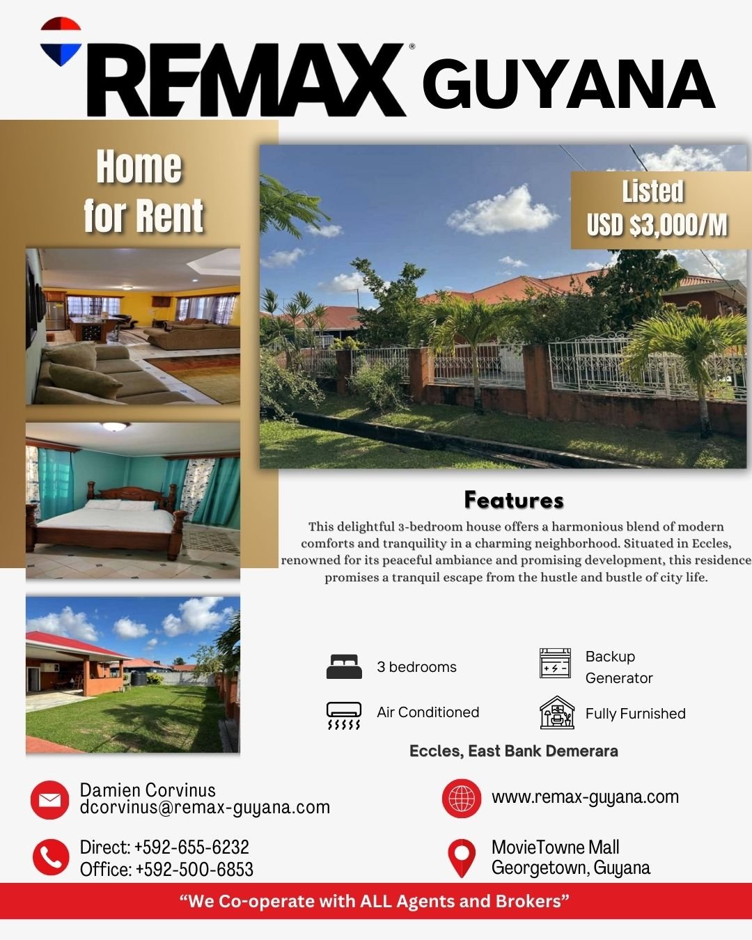 This 3 bedroom, house, fully furnished is available for rental in Eccles. Priced at USD 3,000/month.