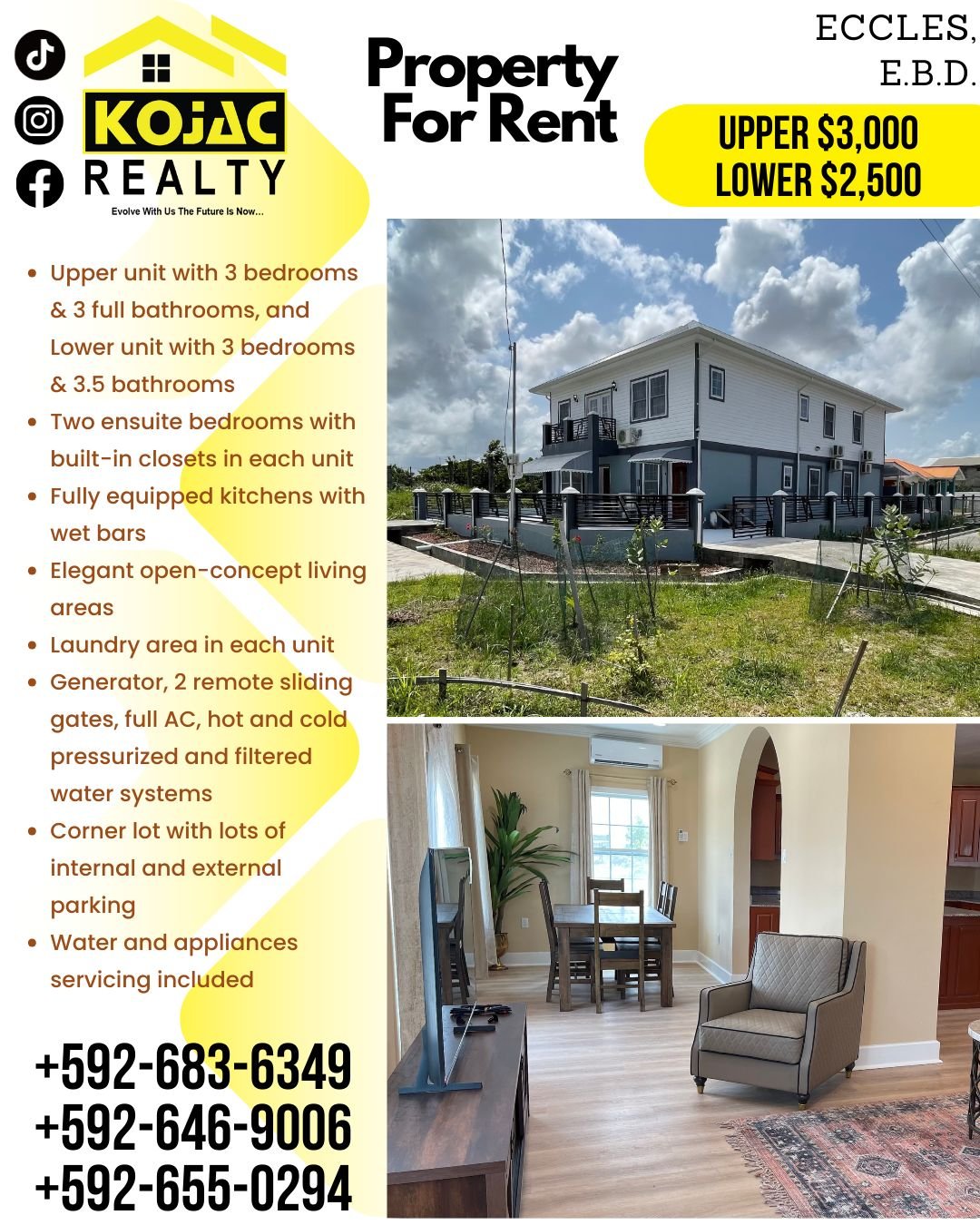 Property for rent in Eccles with 3 bedrooms and 3 bathrooms. Features include built-in closets, fully equipped kitchens with wet bars, elegant open-concept living areas, laundry areas in each unit, generator, 2 remote sliding gates, full AC, hot and cold pressurized and filtered water systems, corner lot with lots of internal and external parking.