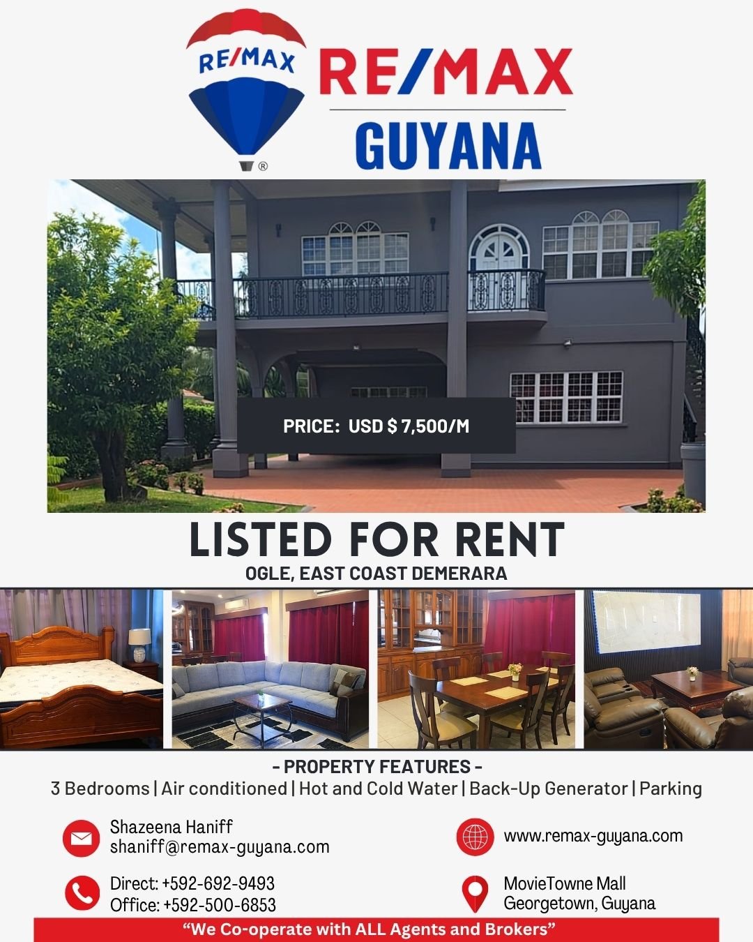 Step into this stunning 3-bedroom, self-contained home in the serene community of Ogle, East Coast Demerara. Fully furnished and thoughtfully designed, it offers a perfect blend of comfort and convenience. Each bedroom comes with its own private bath, and the living spaces are equipped with air conditioning and a pressurized hot/cold water system for year-round ease.