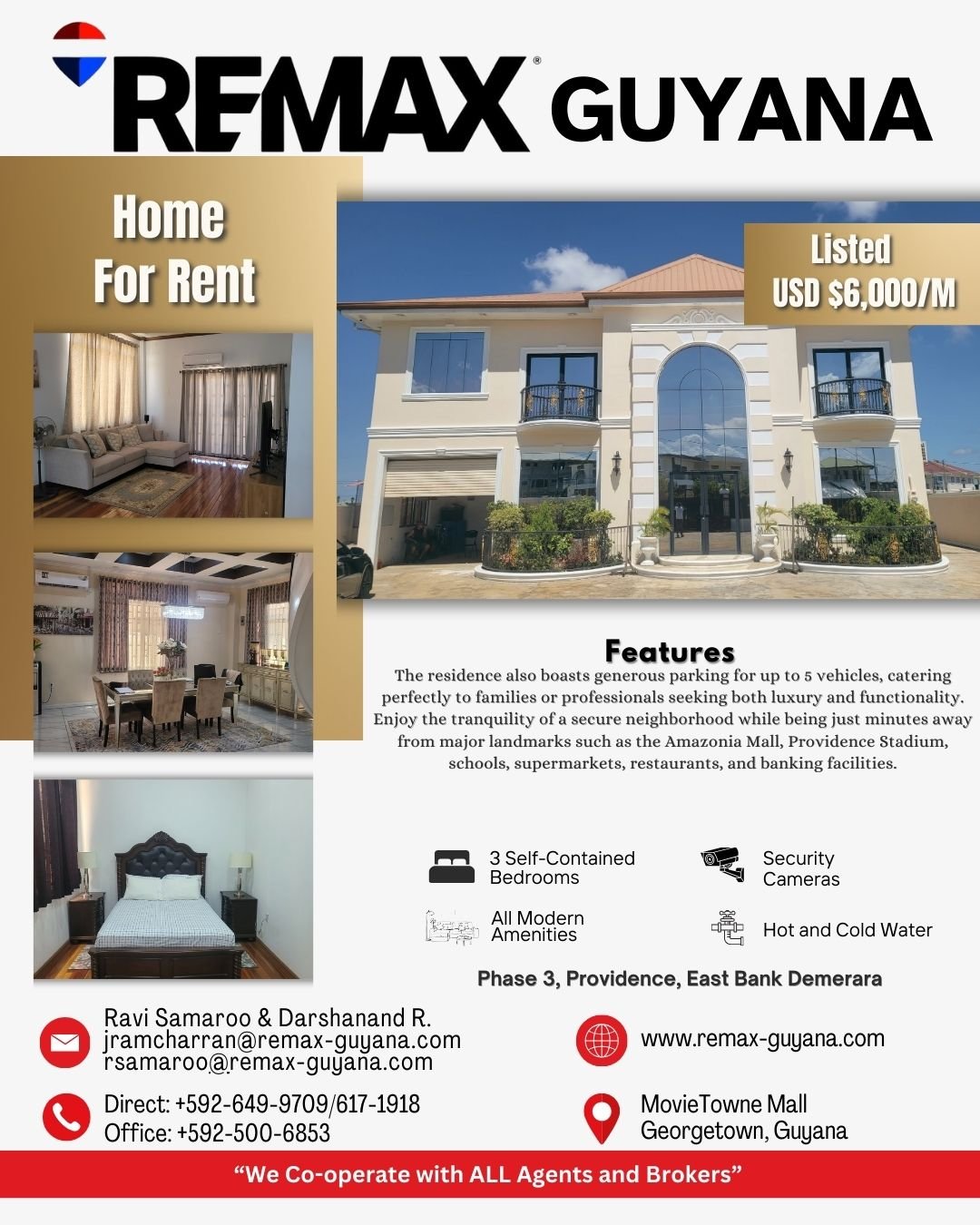 This exquisite fully furnished home features 3 self-contained bedrooms. It is located in the desirable Phase 3 community of Providence, East Bank Demerara and offers modern amenities including air conditioning, a generator, security cameras, hot and cold water, and a premium water filtration system.