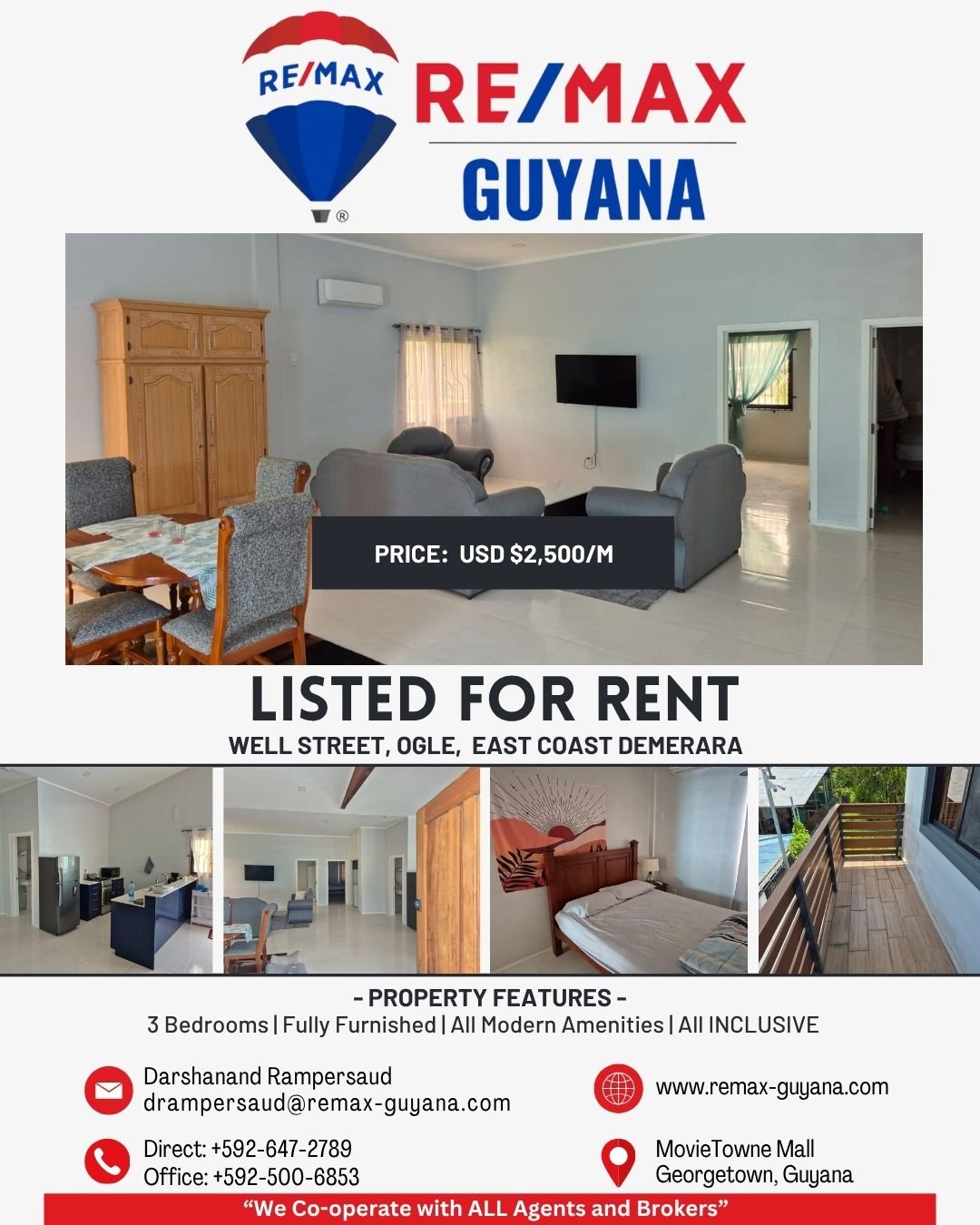 This 3 bedroom, 2 bathroom, house, fully furnished is available for rental in Well Street, Ogle. Priced at USD 2,500/month.