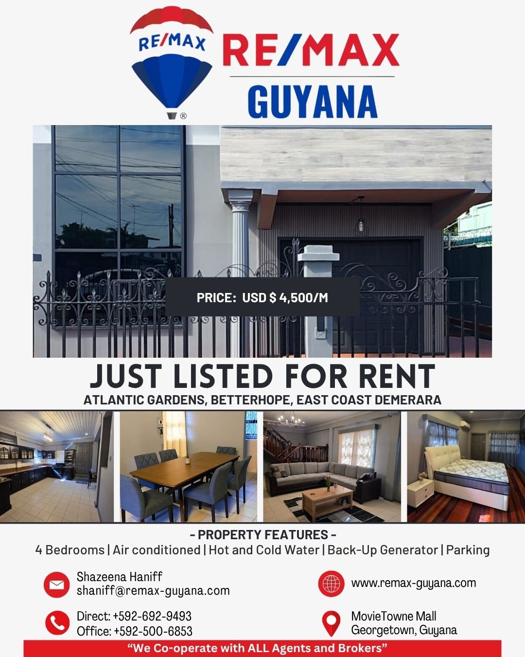 Step into comfort and elegance with this fully furnished 4-bedroom home located in the serene and sought-after Atlantic Gardens, East Coast Demerara. This residence boasts modern amenities including air conditioning, a hot/cold pressurized water system, and secure parking for your convenience.