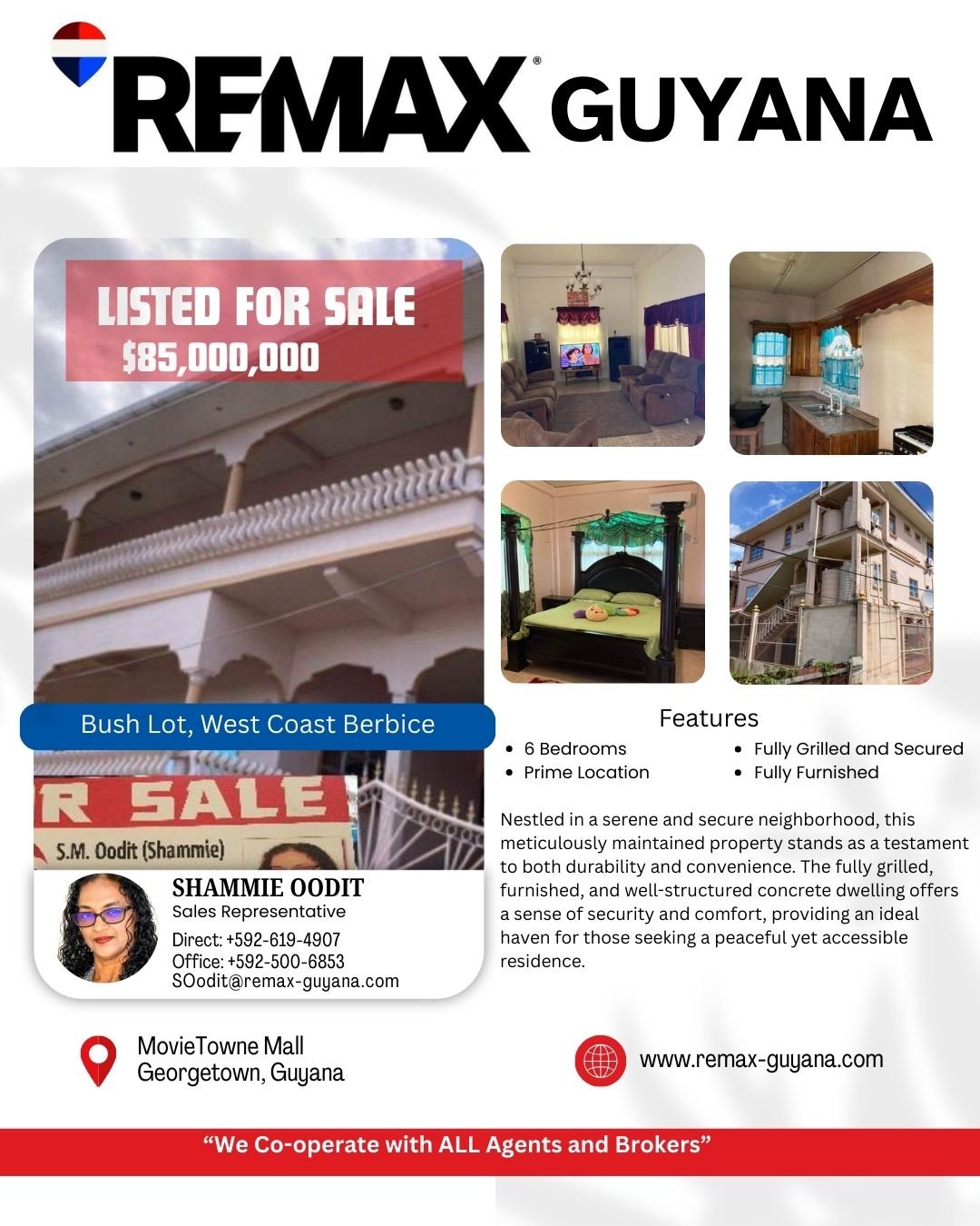 This 6 bedroom, house, fully furnished is available for sale in Bush Lot, West Coast Berbice. Priced at GYD 85,000,000.