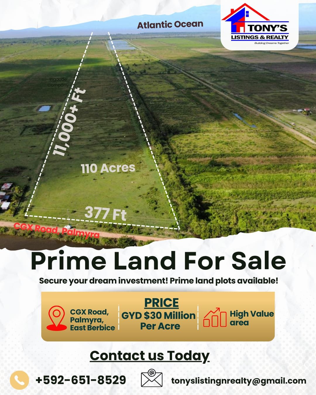 This land is available for sale in CGX Road, Palmyra, East Berbice. Priced at GYD 30,000,000.