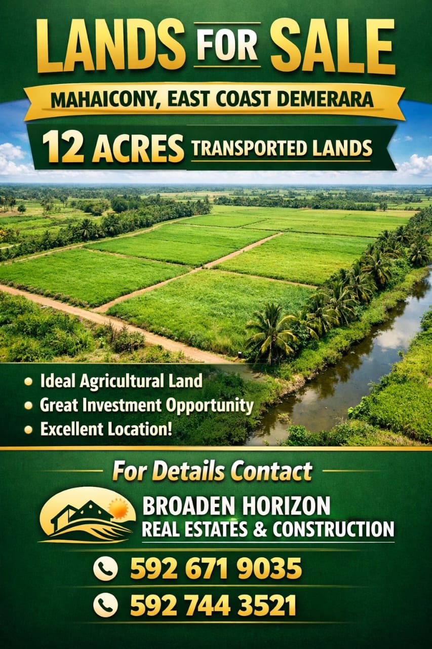 12 acres transported lands for sale in Mahaicony, ideal for agriculture and investment.