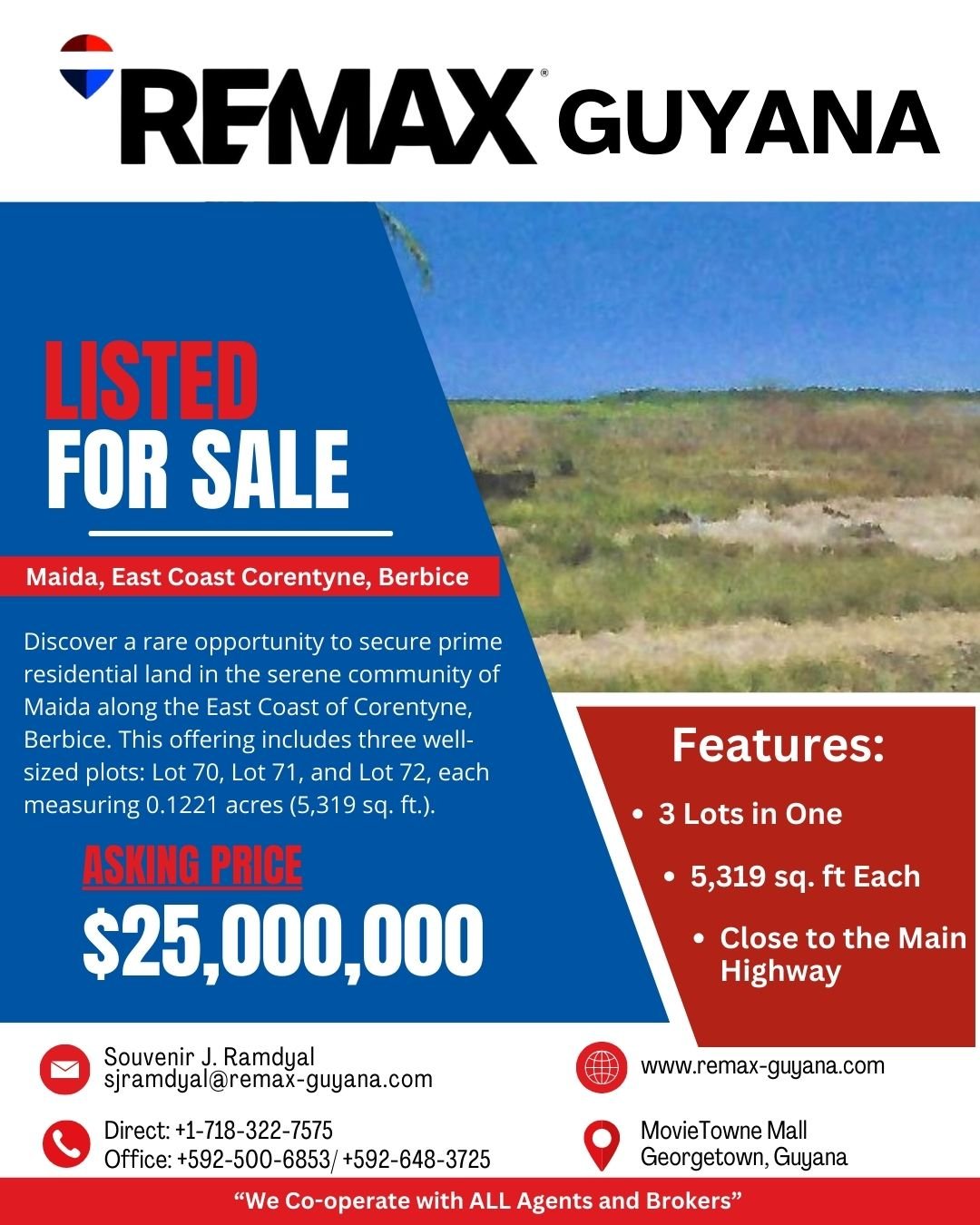 Discover a rare opportunity to secure prime residential land in the serene community of Maida along the East Coast of Corentyne, Berbice. This offering includes three well-sized plots: Lot 70, Lot 71, and Lot 72, each measuring 0.1221 acres (5,319 sq. ft.). These lots are perfect for building your dream home or investing in the growing residential market. They can be purchased individually or as a complete package for GYD $25,000,000