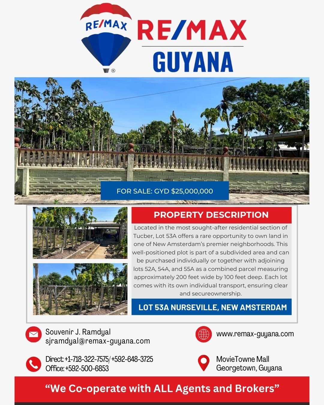 LOT 53A Nurseville, New Amsterdam nestled in the heart of Tucber – the most coveted residential haven in New Amsterdam. This prime property, already subdivided, can be yours individually or as part of an exclusive package with Lot 52A, 54A, and 55A, forming a grand parcel of 200 ft by 100 ft.