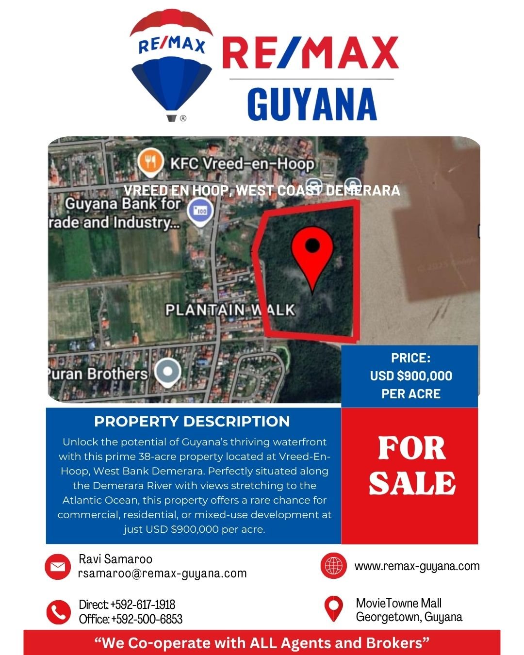 Discover a rare and extraordinary investment opportunity with this expansive 38-acre riverfront property located in the thriving hub of Vreed-En-Hoop, West Bank Demerara. Priced at USD $900,000 per acre, this parcel of land offers unmatched potential for residential, commercial, or mixed-use development along Guyanas highly sought-after waterfront.